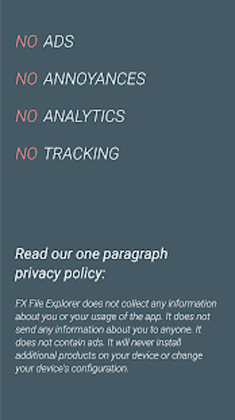 FX File Explorer เป็นเบราว์เซอร์ไฟล์ขั้นสูงสำหรับ Android ในรูปแบบของรุ่นใหญ่อื่นๆ เช่น Astro หรือ ES File Explorer คุณลักษณะที่ดีที่สุด ได้แก่ ความสามารถในการดูและเข้าถึงไฟล์ประเภทต่างๆ และโฟลเดอร์จากอุปกรณ์และการ์ดหน่วยความจำ เรียกดูเนื้อหา และเปิดไฟล์และเอกสารด้วยแอปพลิเคชันที่เลือก นอกจากนี้ยังแสดงพื้นที่ว่างและว่างของแต่ละโฟลเดอร์ เปิดไฟล์บีบอัด และมีโปรแกรมดูรูปภาพและโปรแกรมแก้ไขข้อความของตัวเอง